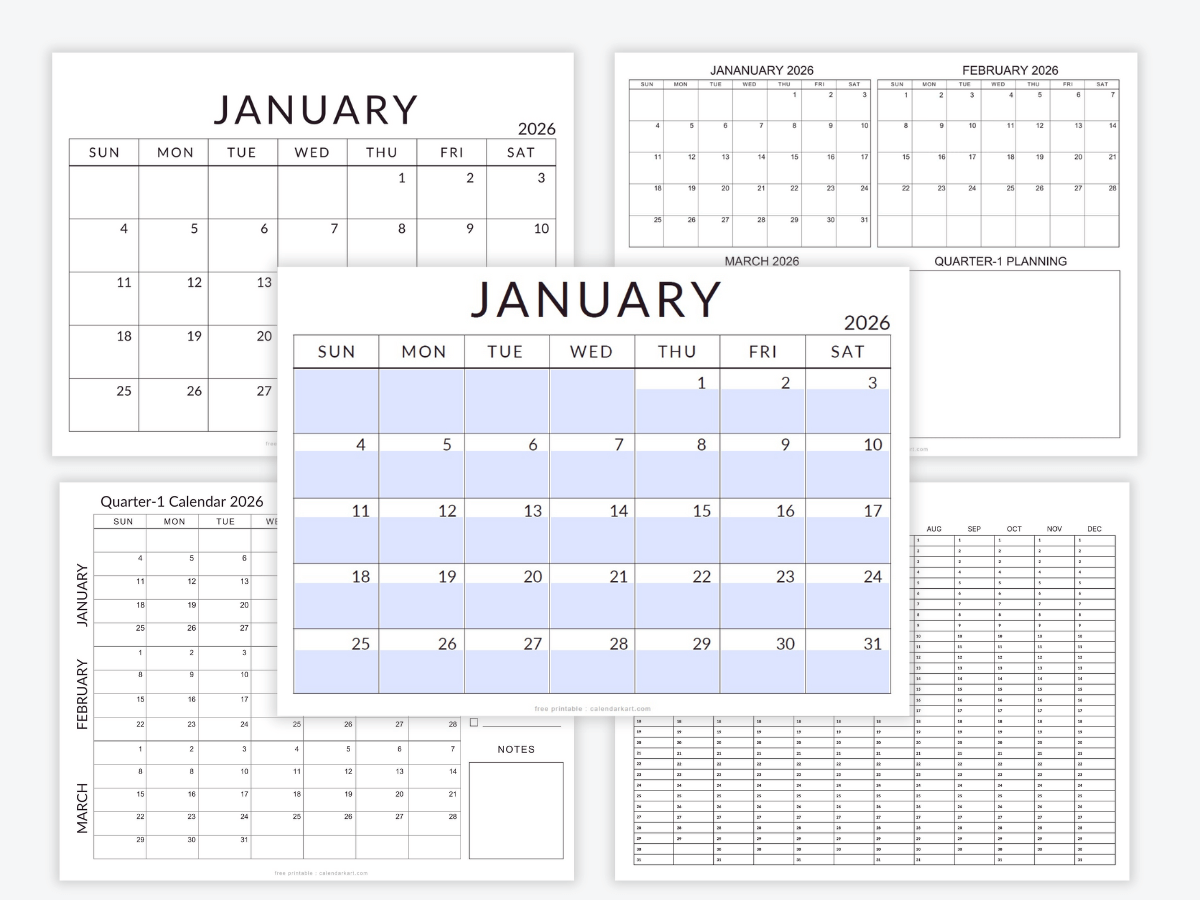 Our editable quarterly calendars help you plan across three months with a clear, structured overview. These templates are especially useful for goal tracking, business planning, and seasonal scheduling. Ideal for