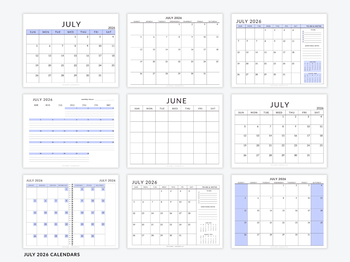 Download free printable July 2026 calendars in minimal and soft pastel styles. These calendars are designed to be easy to print, easy to use, and flexible enough for both personal and professional planning.