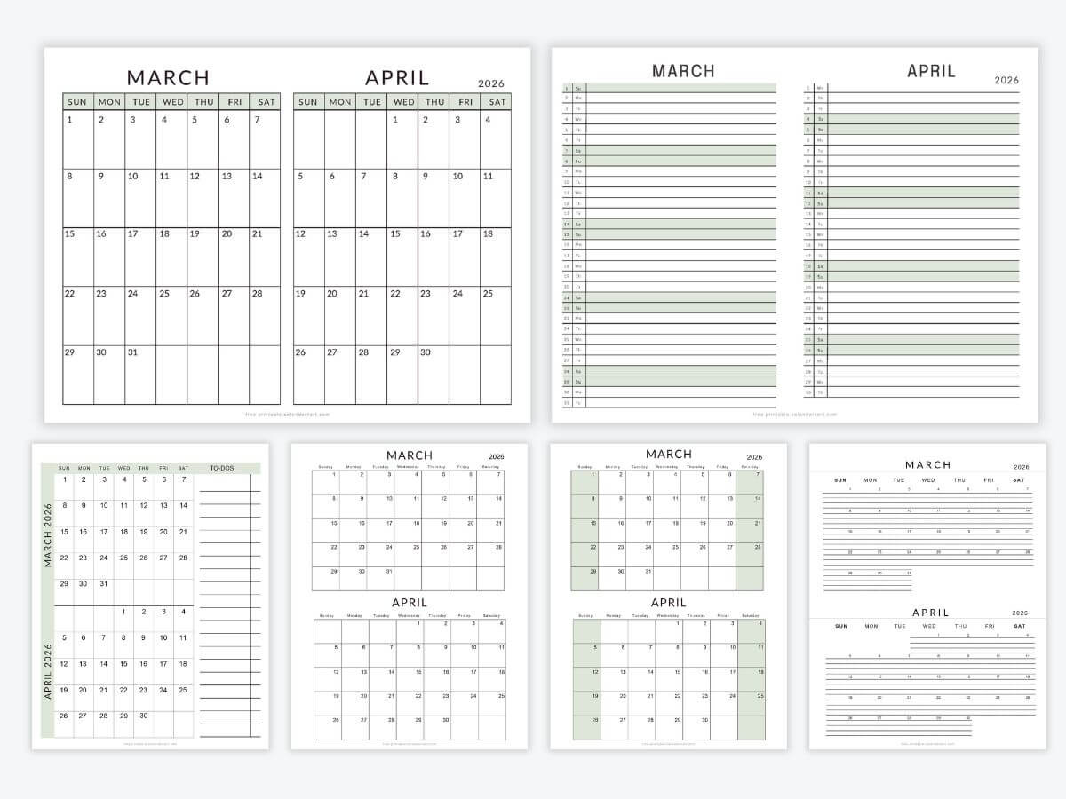 Plan your time across two months with our free printable March–April 2026 calendars, designed to give you a clear and practical overview of both months on a single layout.