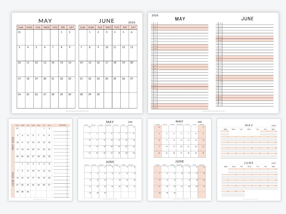 May June 2026 Calendars (Minimal + Soft Pastel)