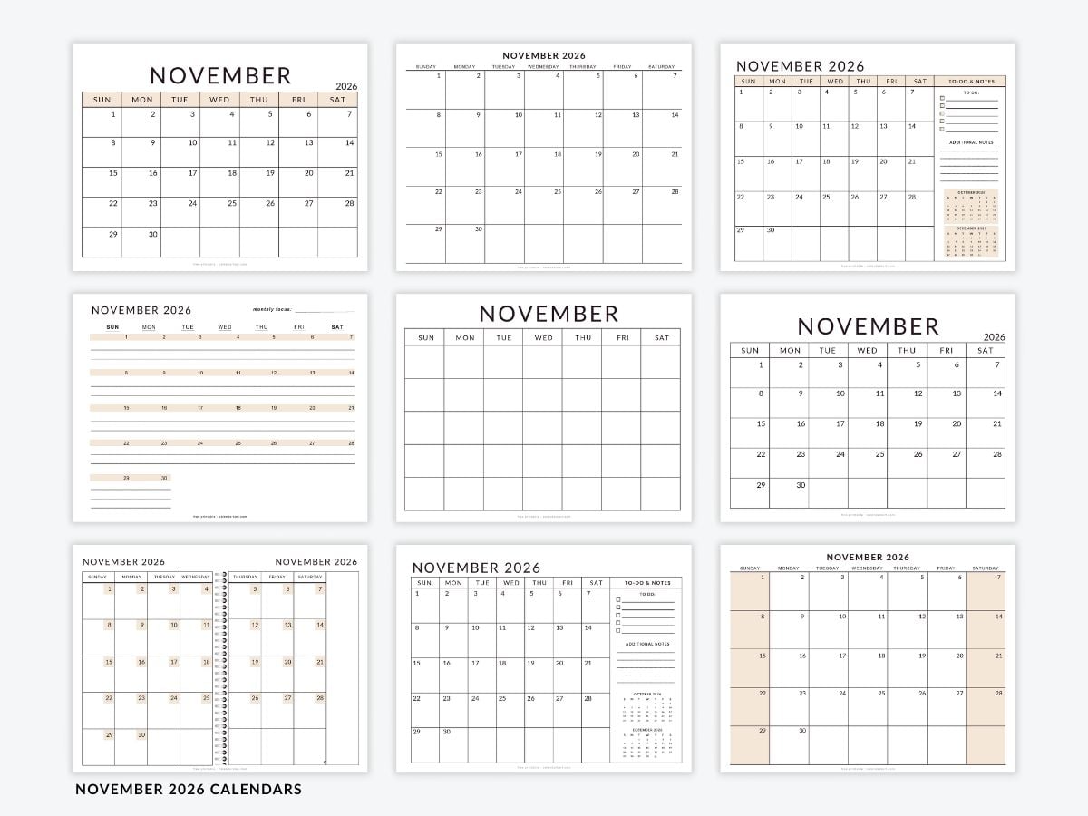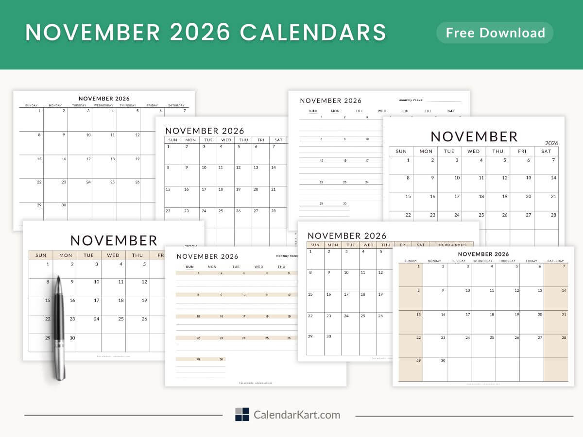 Plan ahead and stay on top of important dates with the November 2026 printable calendars from Calendarkart. From holiday gatherings and travel plans to work goals and year-end preparation, this functional and minimal design gives you the space you need to organize it all. With a printer-friendly layout and clear date boxes, November planning becomes simple and efficient.